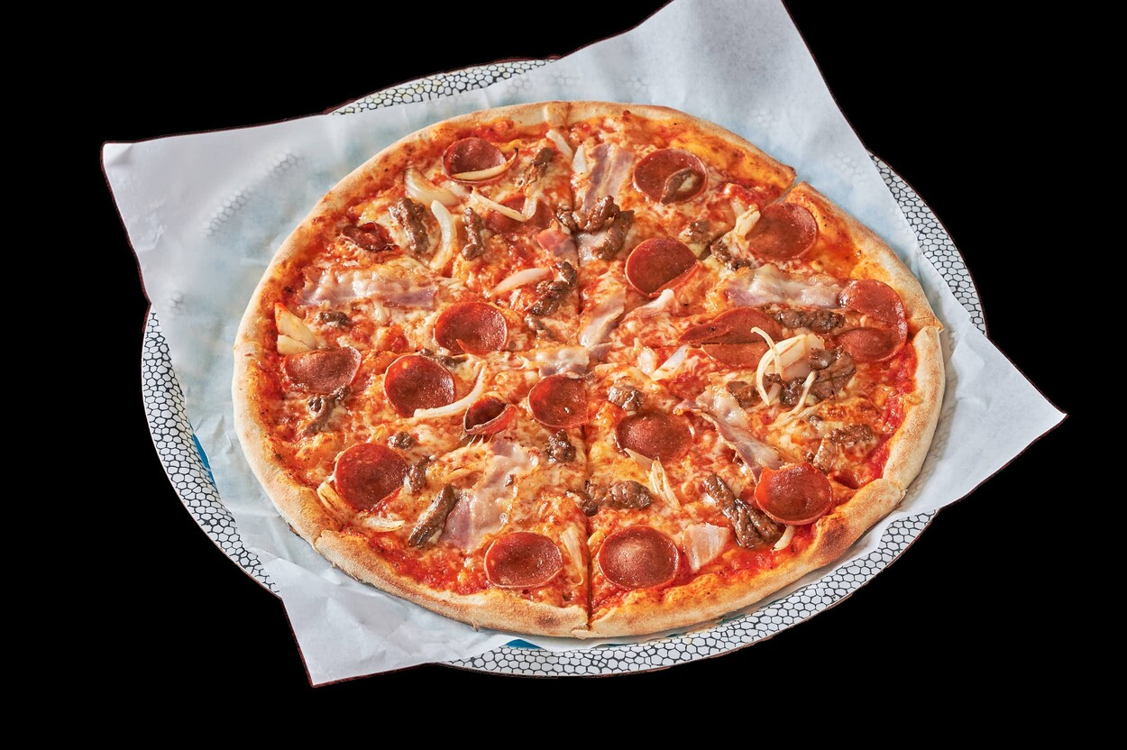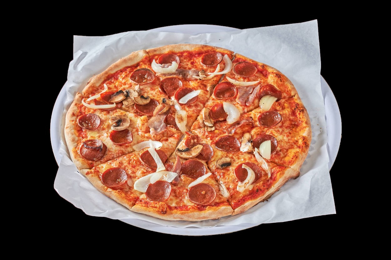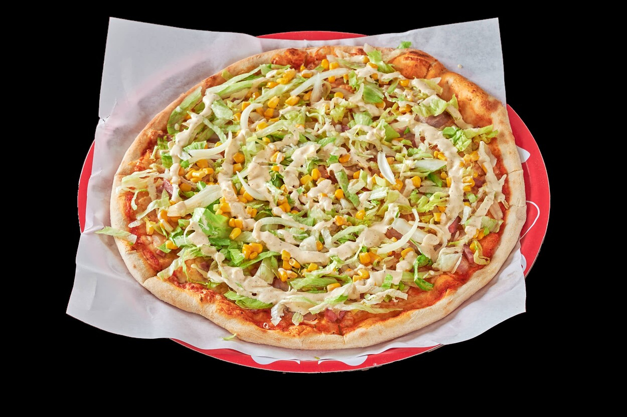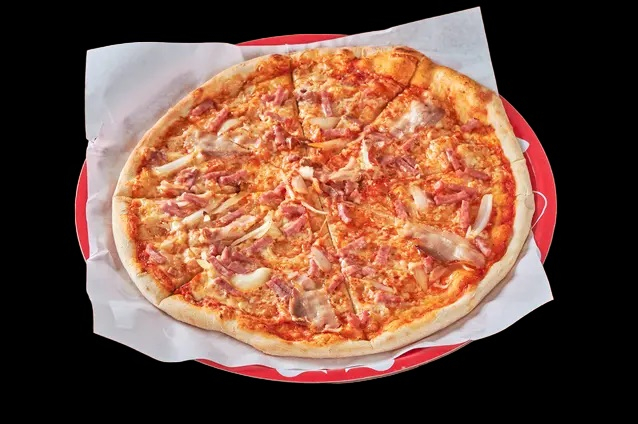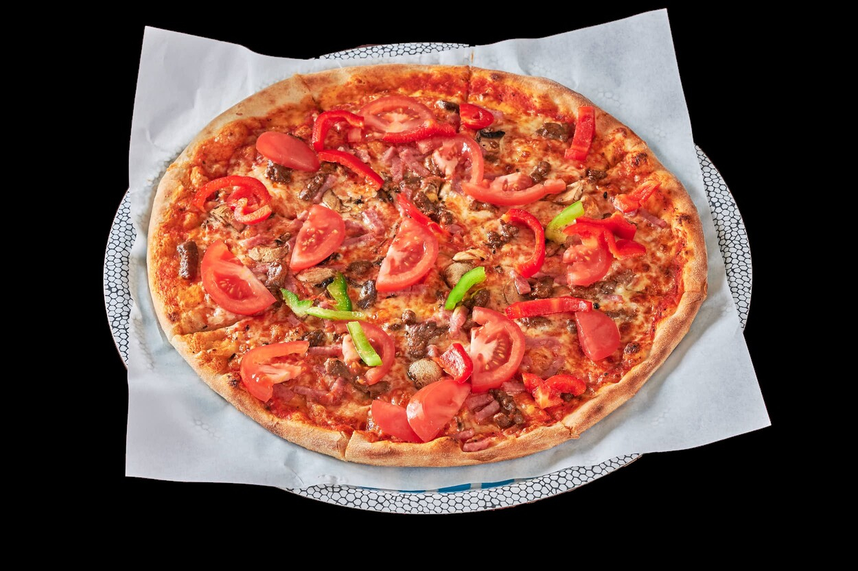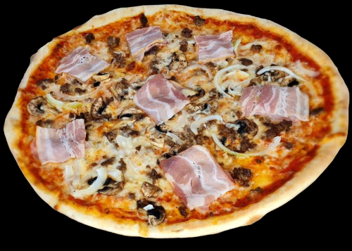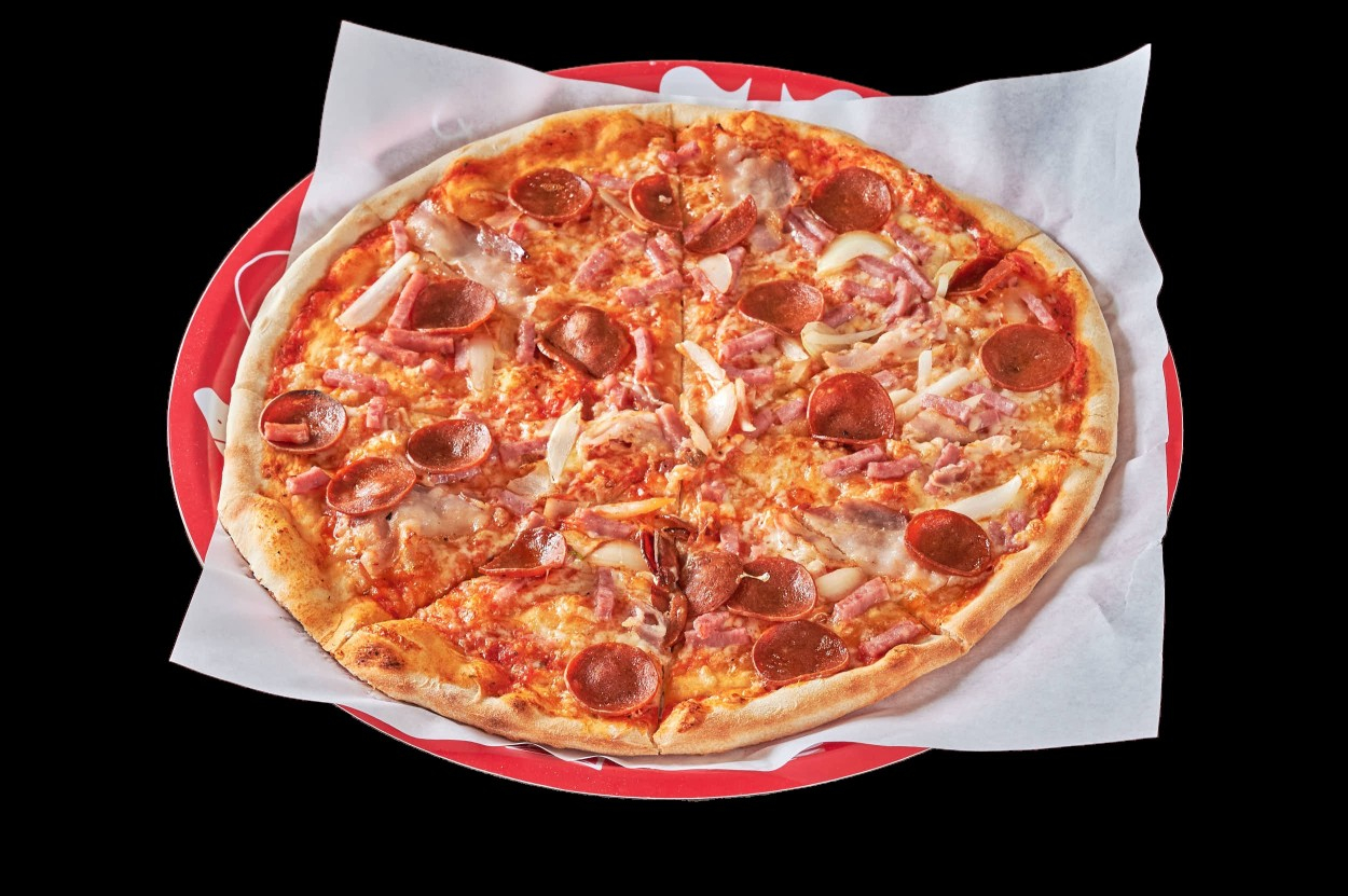 Med tomatsaus, ost, skinke, bacon, løk...