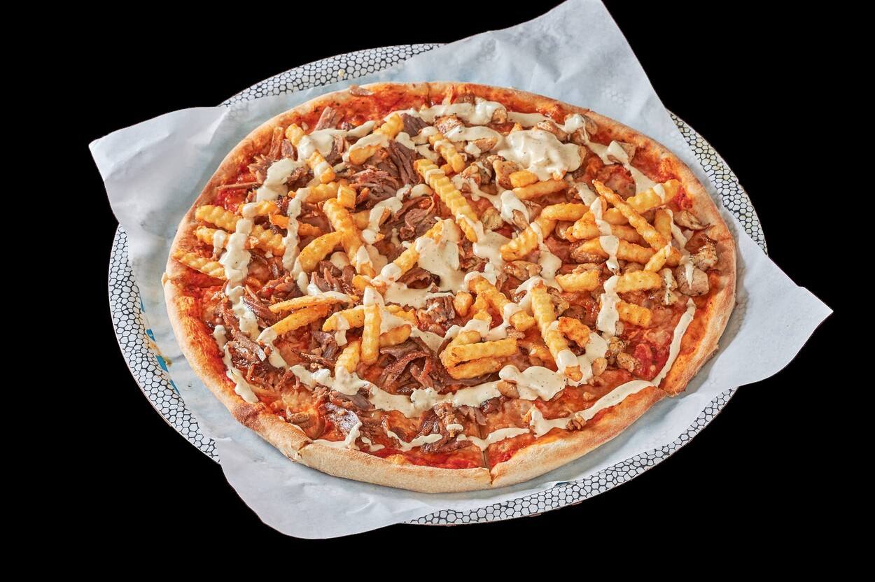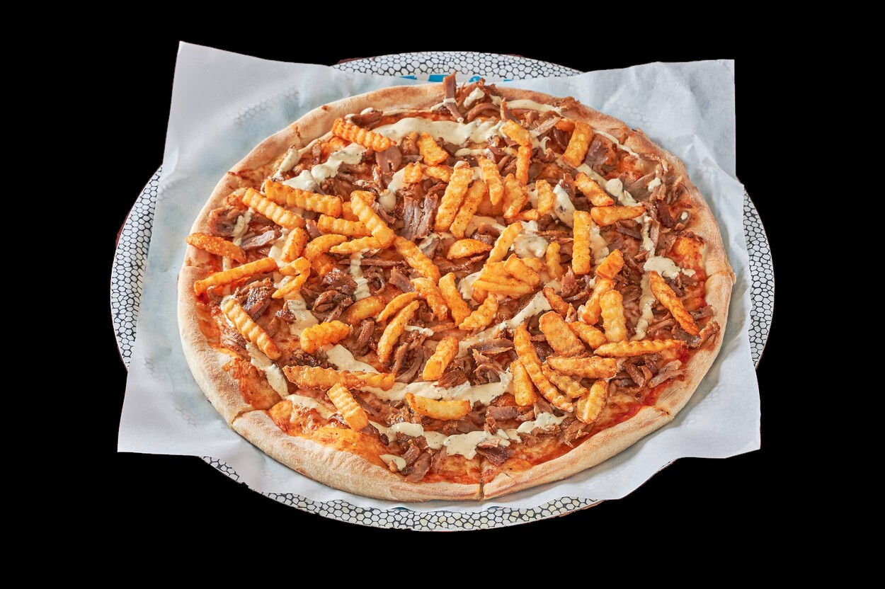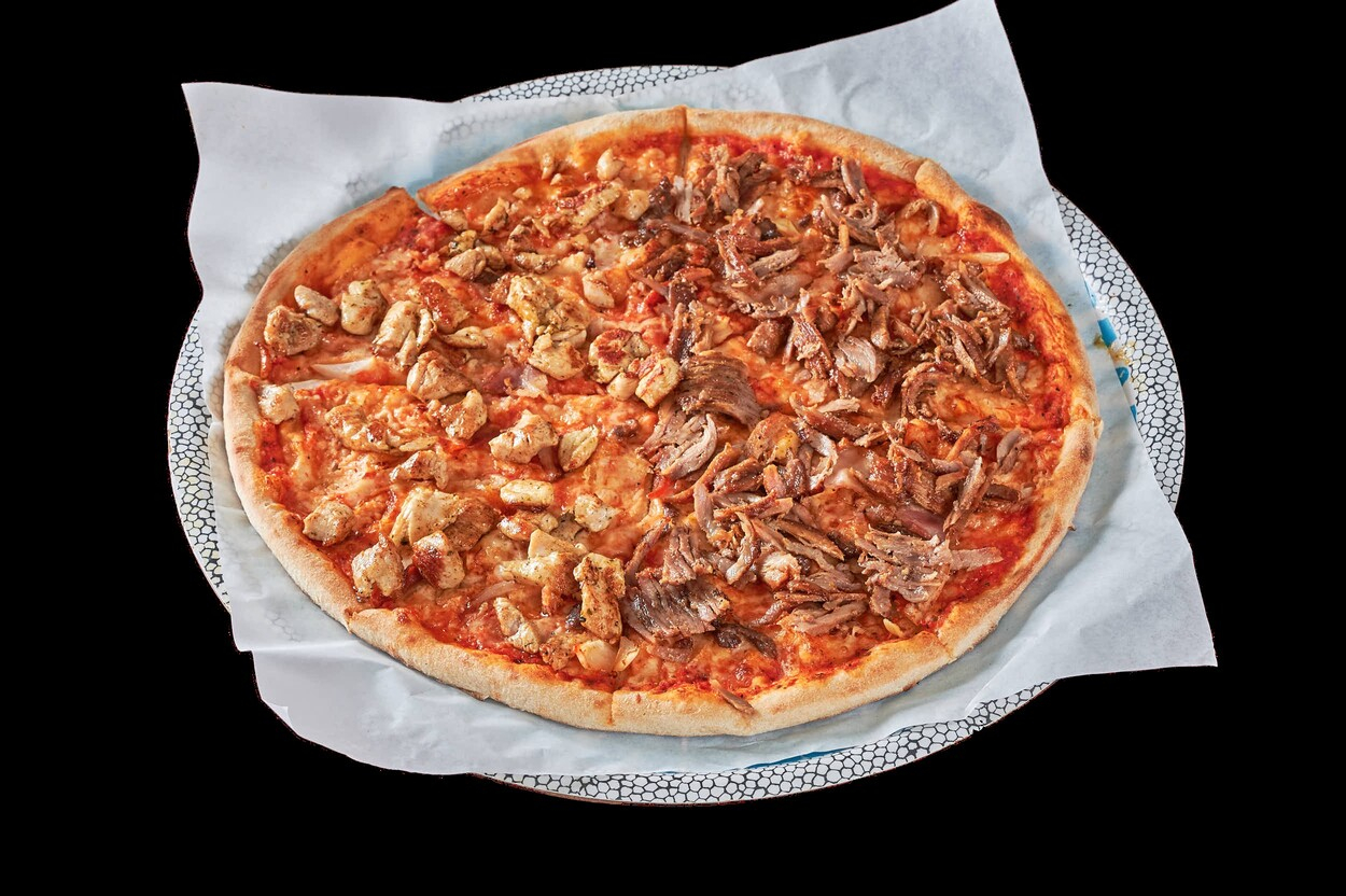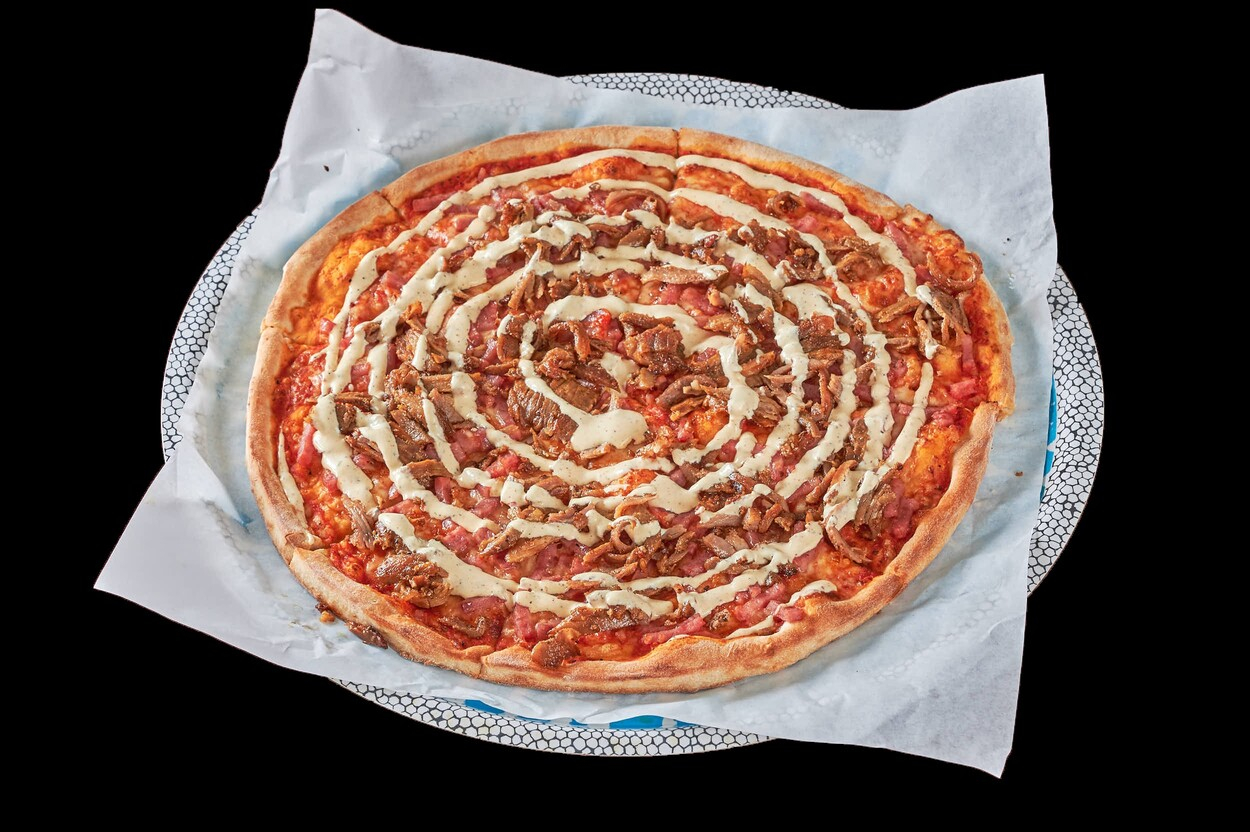 Med tomatsaus, ost, kebabkjøtt...