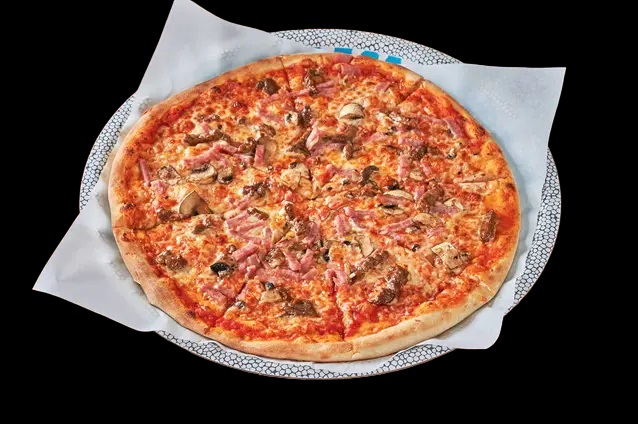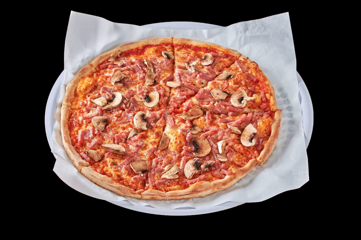 Med tomatsaus, ost, skinke, champignon...
