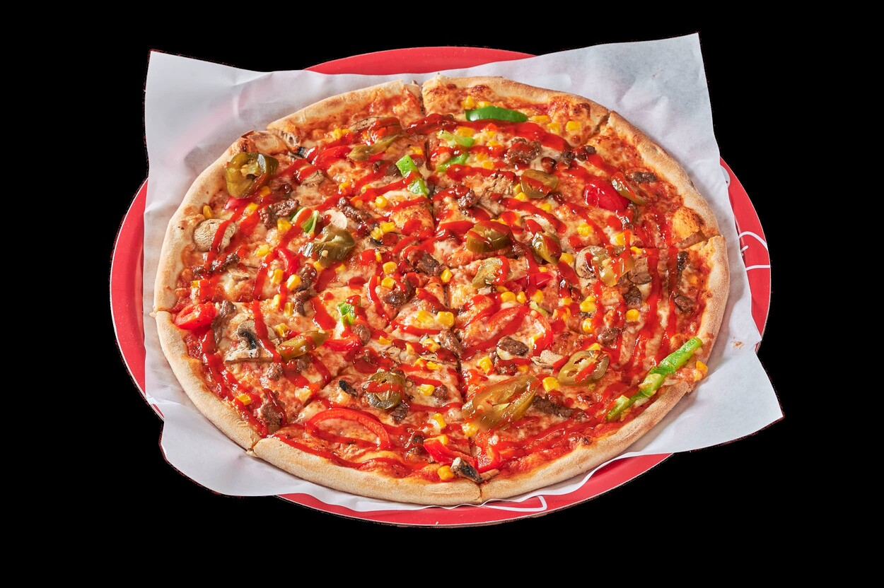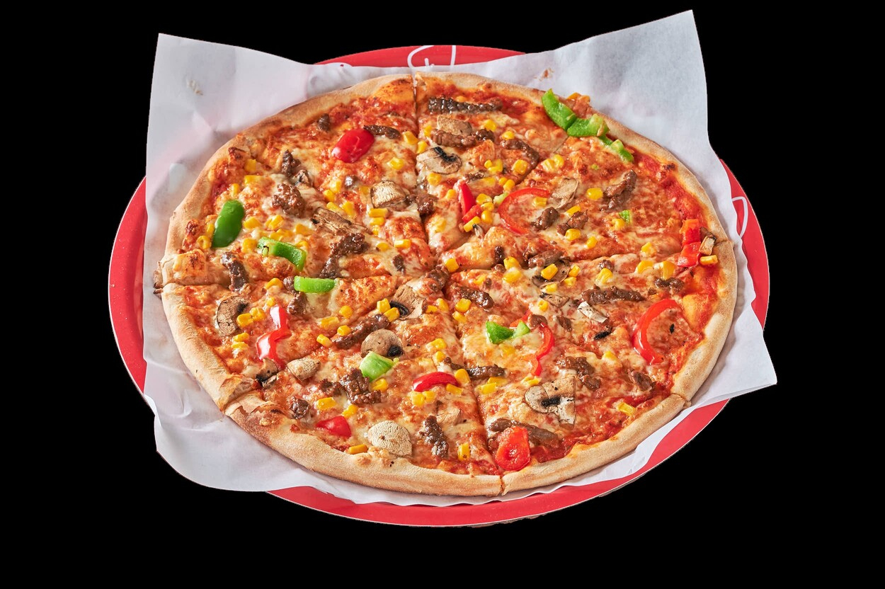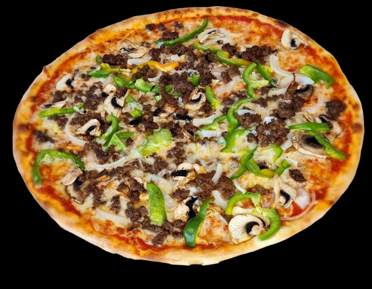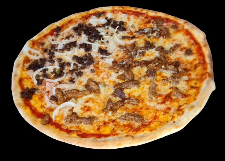 Med tomatsaus, ost, biff, champignon,...