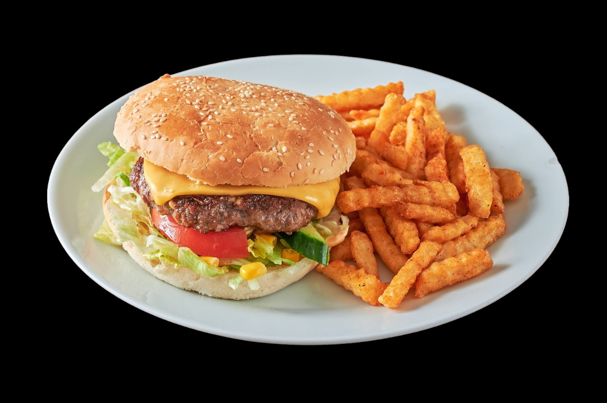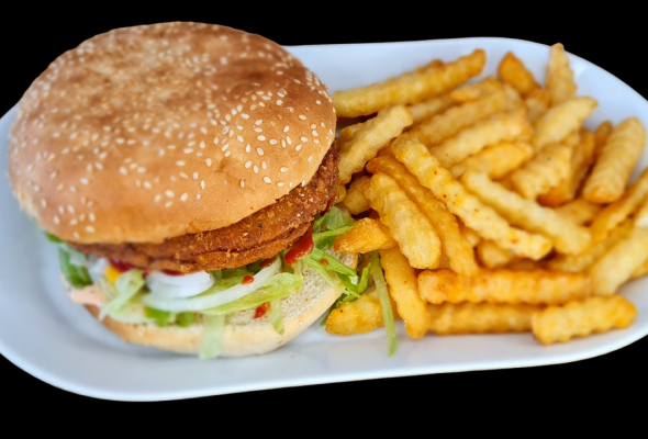 Med salat, pommes frites, dressing,...