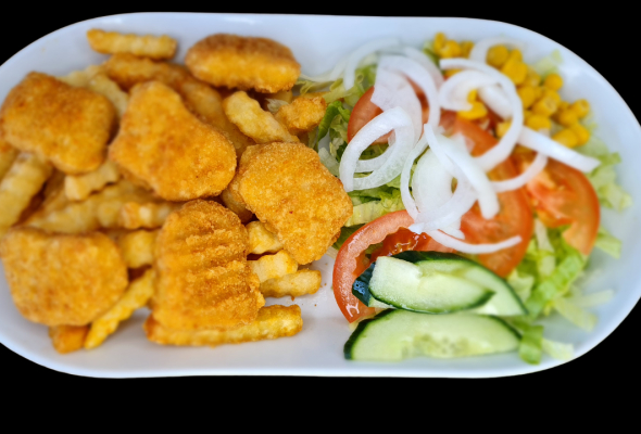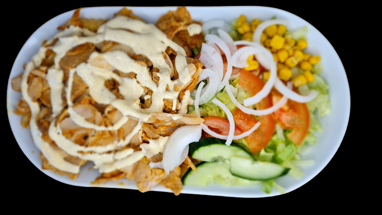 Med salat , pommes frites, dressing ,...