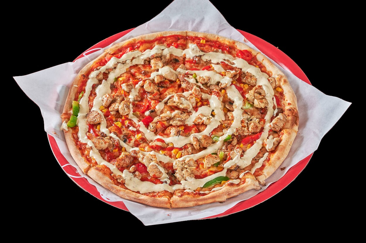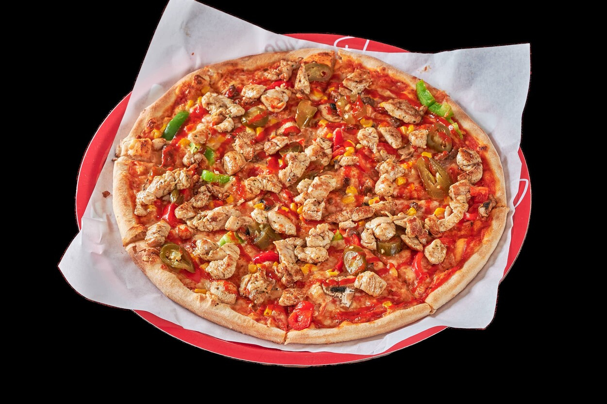 Med tomatsaus, ost, kylling, løk,...