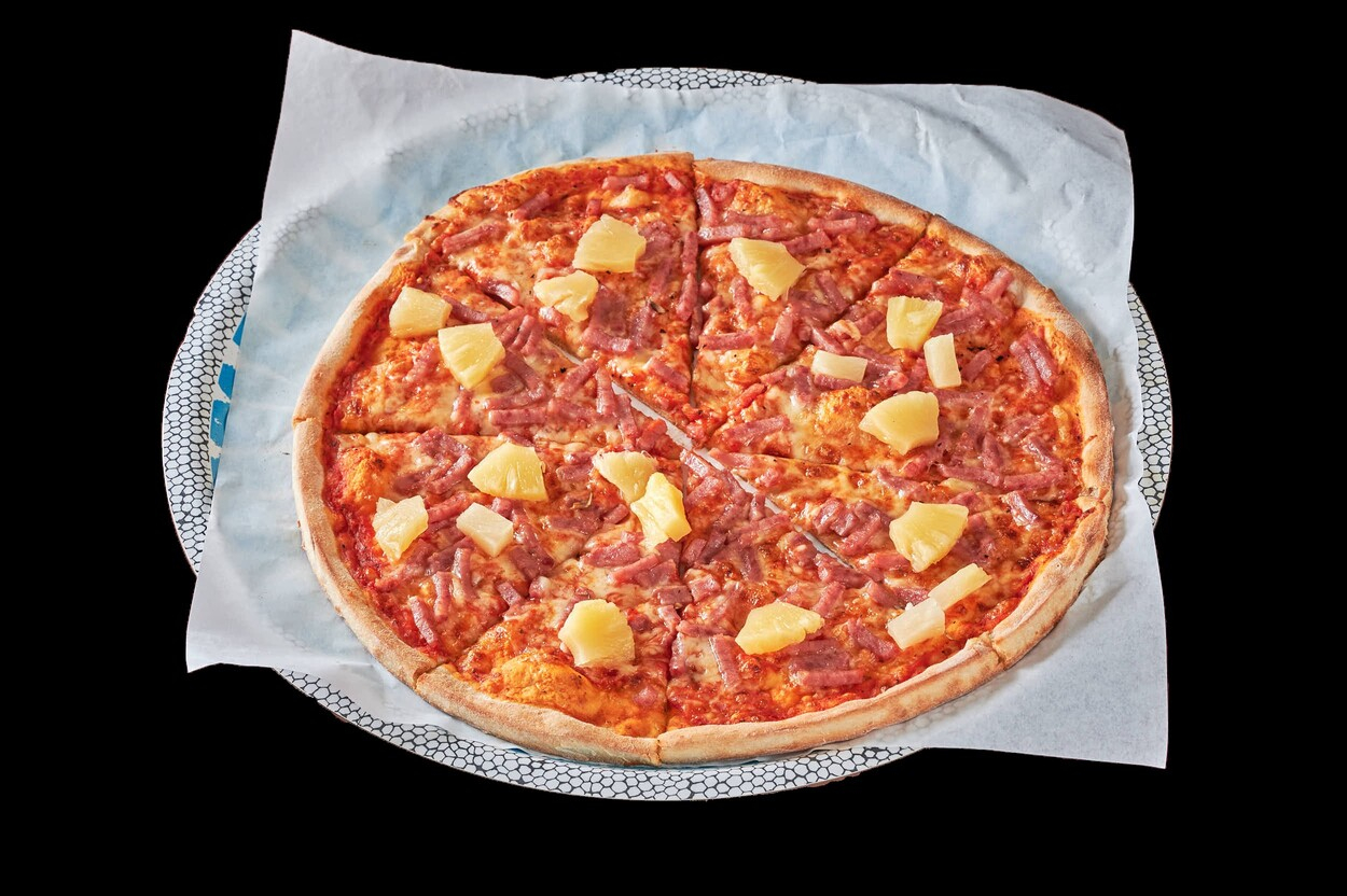Med tomatsaus, ost, skinke, ananas og...