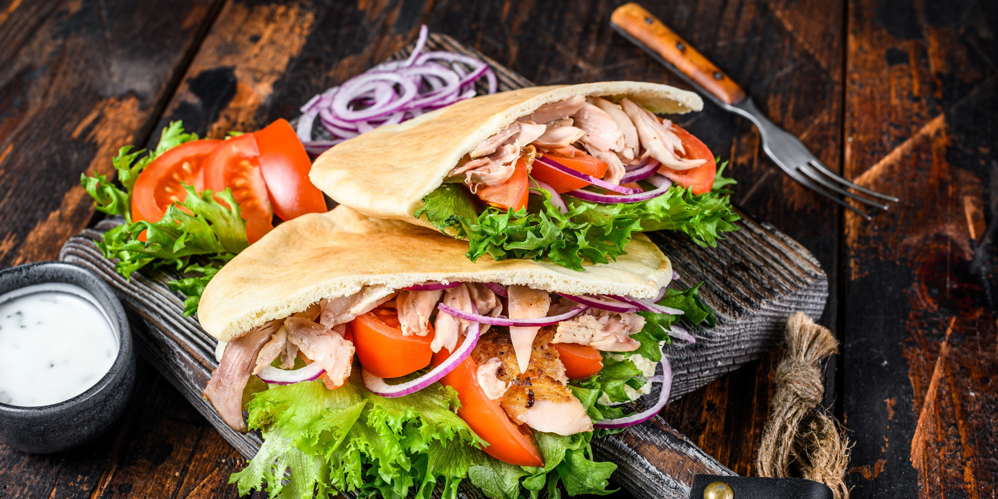 Hjemmebakt brød, kylling salat, tomat,...