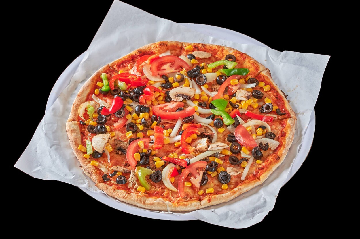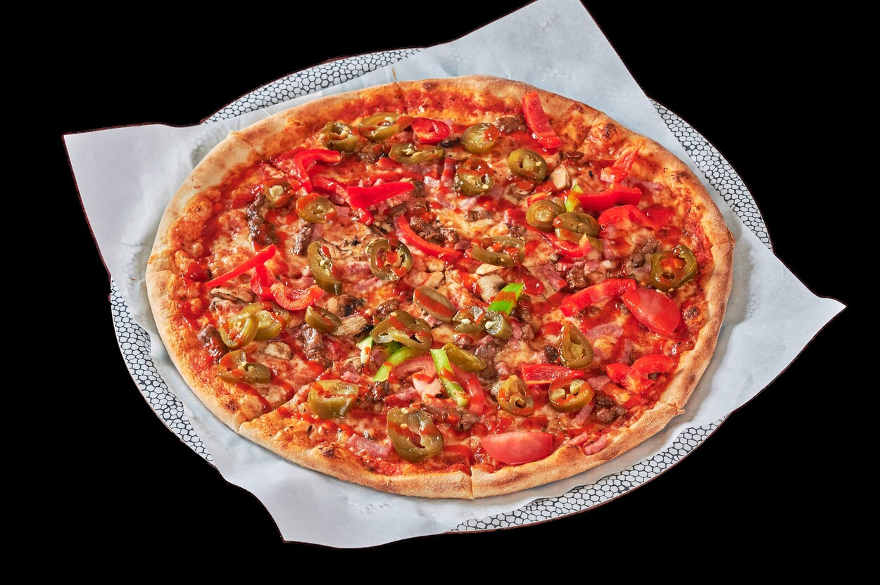 Med tomatsaus, ost, paprika, løk,...
